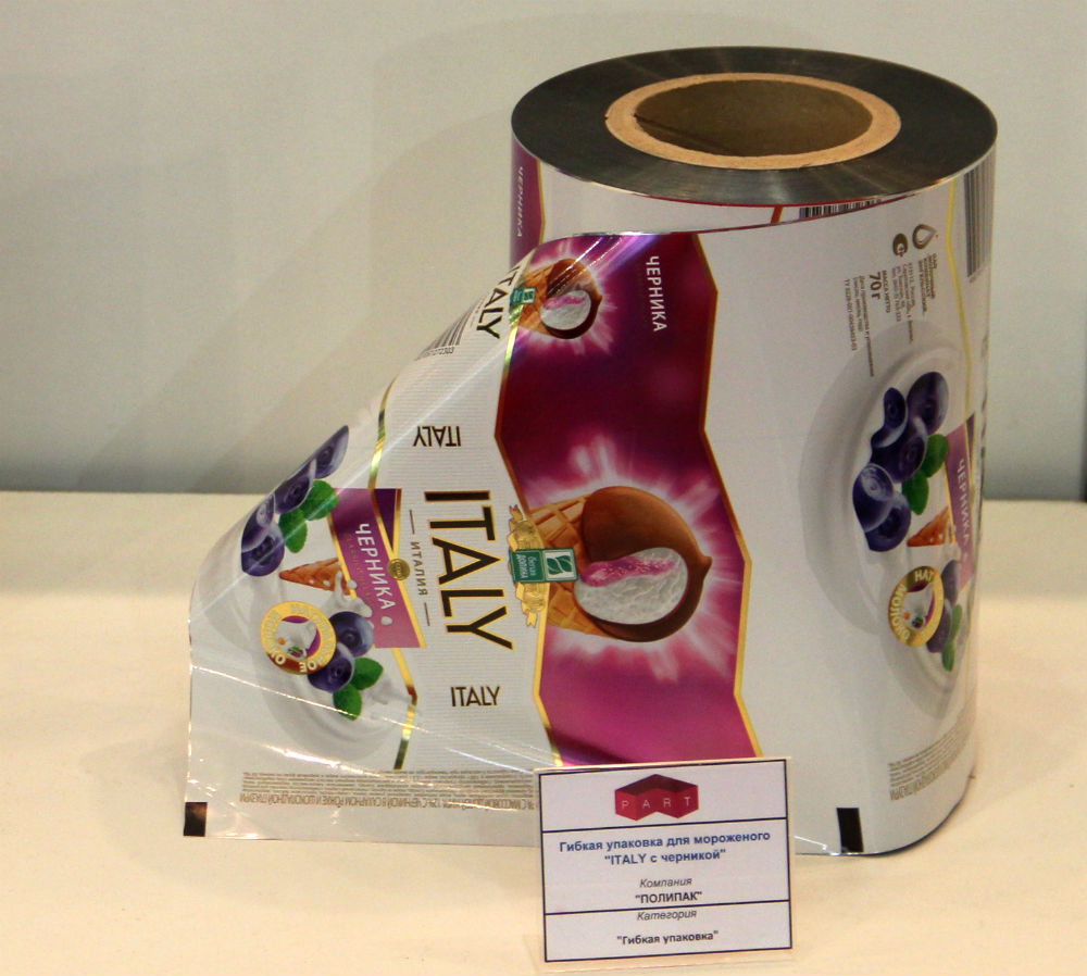 ЗАО «ПОЛИПАК» представило на конкурс образец гибкой упаковки для мороженого «ITALY с черникой». Допечатная подготовка и печать дизайна данного образца была выполнена способом флексографской печати с применением технологии Opaltone, включающей в себя сертифицированный процесс допечатной подготовки и процесс печати (сертификация красок и печатного оборудования). Использование дополнительных цветов - Red, Green, Blue - к стандартной триаде CMYK расширяет цветовой диапазон до 2800 оттенков и преодолевает недостатки насыщенности цветов CMY, достигая большего оптического контраста и более богатых и ярких цветов. Также в дизайне дополнительно использовались элементы вывороток в белой краске для получения имитации «золота».