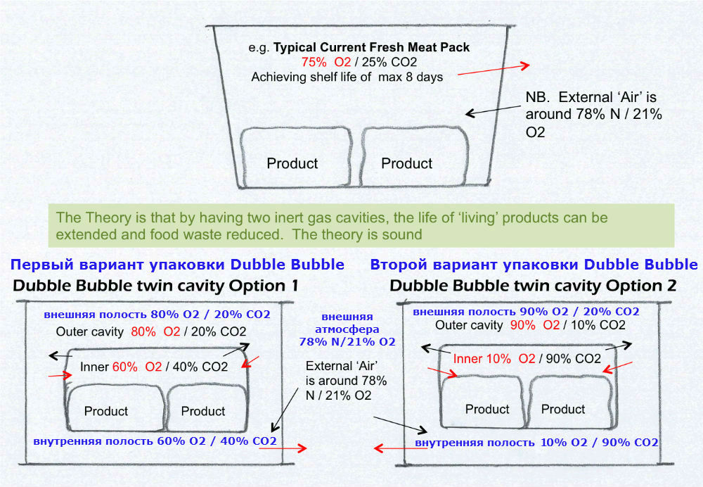 Как видно из нижеприведенной схемы, две полости с продуктами находятся внутри двух других, вложенных друг в друга, внешних полостей, заполняемых смесью кислорода и углекислого газа. Первый вариант – 10% кислорода и 90% углекислого газа во внутренней и 90% кислорода с 10% углекислоты во внешней полости. Вторая версия – 60% кислорода и 40% углекислоты для внутренней, при 80% кислорода и 20% углекислого газа для внешней. Собственно каверны с продуктами наполнены инертным газом.