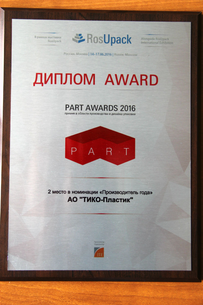В 2016 году ТИКО-Пластик впервые принял участие в Международном конкурсе на лучшую упаковку PART Awards, который проводился в рамках выставки RosUpack, и сразу стал ее победителем.