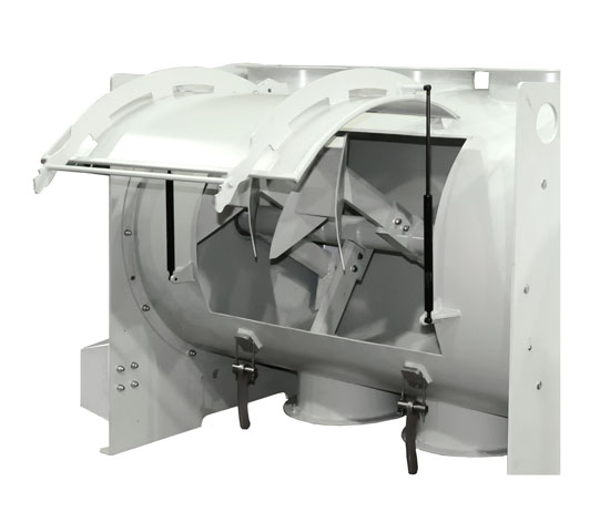 Горизонтальное исполнение корпуса смесителя с оптимальным расположением выгрузного люка предотвращает залегание смешиваемого продукта и увеличивает скорость выгрузки компонентов.