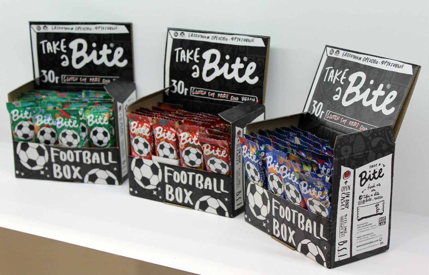 Интересно решение упаковки натуральных батончиков Bite с футбольной символикой. Здесь использовалась технология «мозаика». На машине HP Indigo 6800 было отпечатано 500 тыс. упаковок. И среди них нет двух одинаковых. В каждой меняется если не изображение, так цвет.