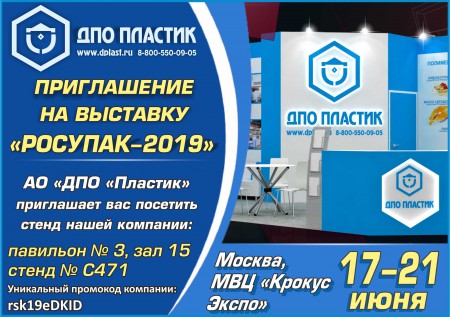 До встречи на выставке RosUpack 2019 на стенде компании ДПО Пластик в Павильоне №3, зале №15 и стенде C471 — с 18 по 21 июня 2019 года!