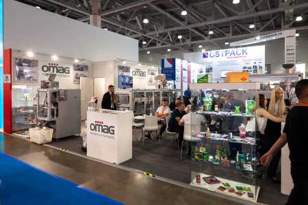 Привычным был и показ техники на стенде OMAG: фасовочный автомат в «стики» модели DIVA в исполнении пять ручьев, фасовочный автомат C3V/2 , формирующий «саше» в два потока, автомат горизонтального типа модели СО, изготавливающий и наполняющий «дойпаки».
