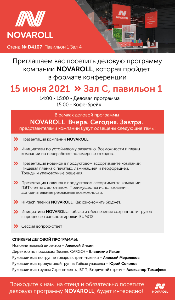 Во вторник, 15 июня, в рамках деловой программы выставки RosUpack-2021 пройдет конференция «Вместе к новым вершинам», организованная компанией NOVAROLL.