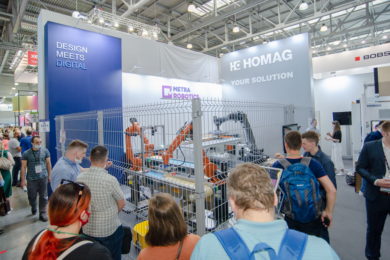 Компания Векас демонстрировала комплекс на основе роботов производства компании Universal Robots, компания «Промэнерго автоматика» представила палетоукладчик на основе того же робота. НПП «Метра» из Обнинска представила комплекс, в котором работали 2 робота KUKA, ещё техника от упомянутой здесь компании HOMAG. Мало того, ещё ползал коллаборативный робот-тележка созданный, как уверяли на стенде, в самом Обнинске. Уж не знаю, столько в нем присутствовало деталей местного изготовления, а сколько импортных комплектующих, но робот вышел отечественный.