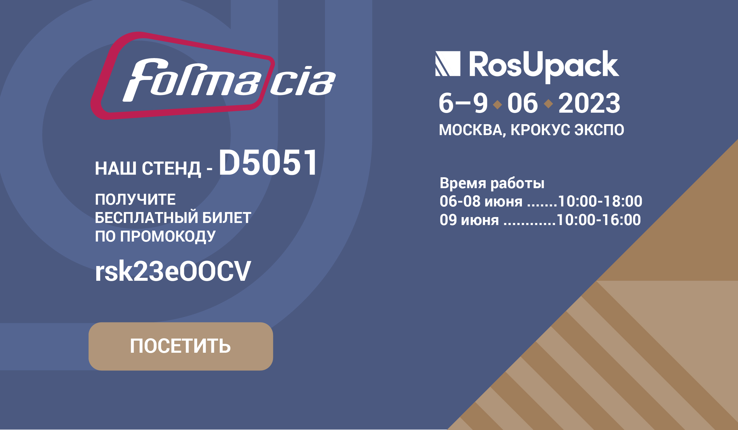 Компания «Формация» приглашает посетить свой стенд № D5051 (павильон 1, зал 4) на 26-й Международной выставке упаковочной индустрии RosUpack-2023, которая пройдет с 6 по 9 июня в Москве в МВЦ «Крокус Экспо».