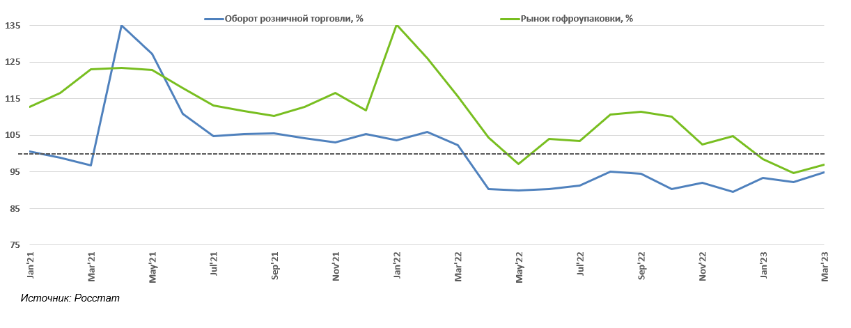 Согласно данным Росстата, начало 2023 года демонстрирует снижение темпов роста рынка гофроупаковки на 3,3%. Несмотря на положительную динамику роста в первом квартале продуктового сегмента на 4,7% и напитков на 1,7%, падение продемонстрировали такие категории непродовольственных товаров, как керамическая плитка на 38,4%, напольные покрытия на 14,9%, телевизоры на 32%, стиральные машины на 38,7%, холодильники на 17,6%, изделия из стекла на 16,9%, обои на 4,7%. Безусловно это явилось следствием текущего тренда оборота розничной торговли, который в первом квартале также демонстрирует падение на 6,5%.