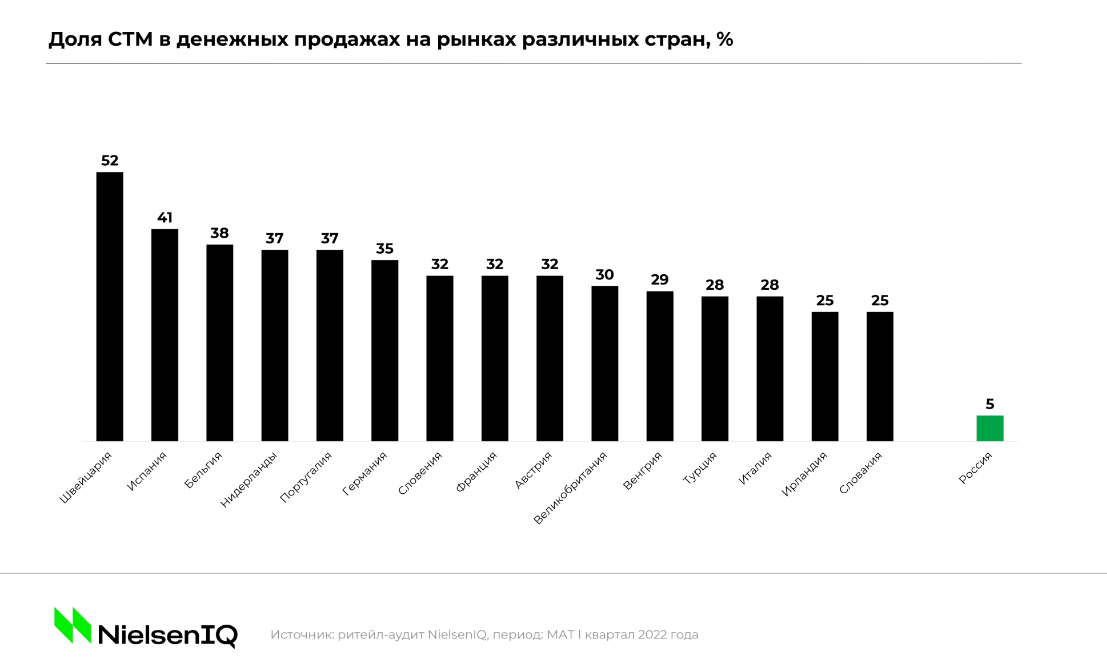 Сберегательная модель поведения привлекает все больше внимания со стороны потребителей к дискаунтерам и жестким дискаунтерам с собственной моделью управления затратами. СТМ (собственные торговые марки) год от года прочно усиливают свои позиции. Самый высокий рост спроса на СТМ в продуктовой рознице наблюдается в таких сегментах, как молочная продукция, бакалея, замороженные продукты, кулинария. В непродовольственной сфере – в бытовой химии, средствах личной гигиены, текстиле. Рост в категории СТМ продолжится, чему будет способствовать фокус сетей на качество товаров, расширение ассортимента и рост мероприятий по продвижению товаров. Согласно данным Nielsen IQ, доля СТМ в денежных продажах в России имеет огромный потенциал для роста и развития.
